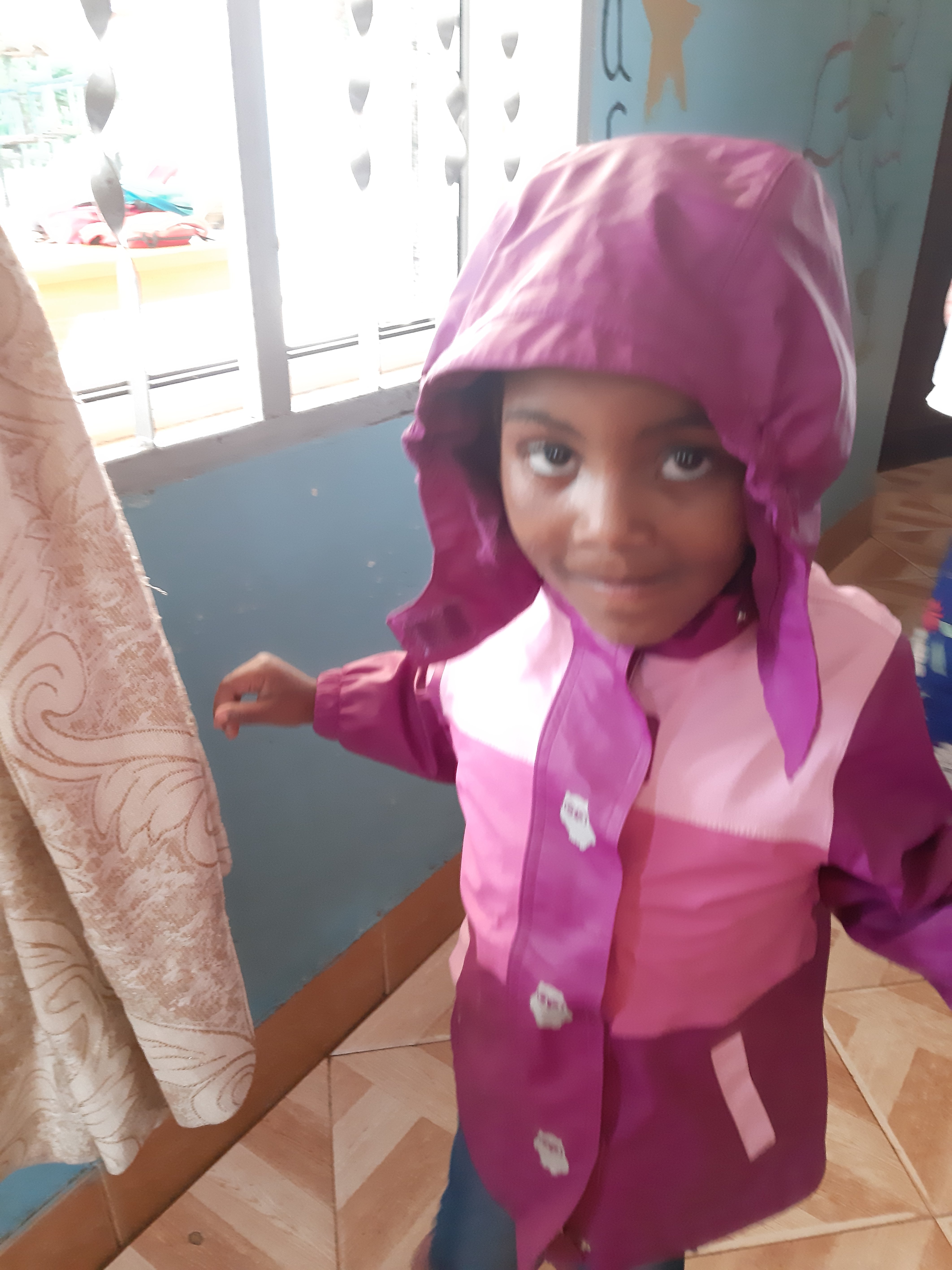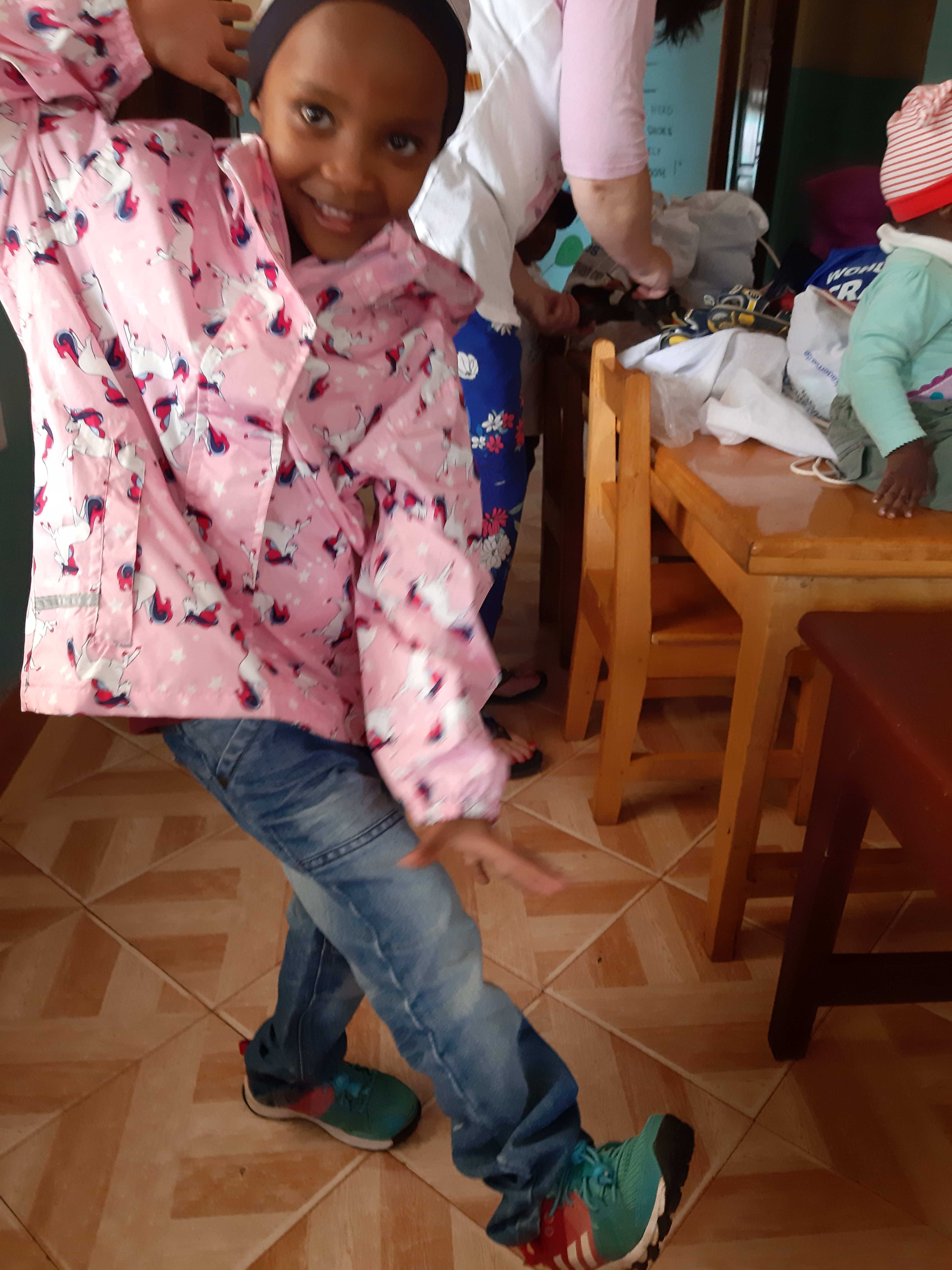 Und dann ist da noch dieser Kofferinhalt, den Annett von einer Freundin zuhause mitgebracht hat. In ganz viele Beutel verteilt hat sie das heute mit dabei und stellt es auf den Tisch. Hosen, Oberteile, Schuhe, Mützen, Regenjacken – der Wahnsinn. So viele tolle Sachen. Und die Kinder sind so aufgeregt und rennen sofort mit der Klamotte, die wir ihnen in die Hand drücken los zum aus/umziehen. Jacke an und wieder aus. Schuhe? Nein ? nicht schön genug? Ok! Dann andere. Und so weiter. Mützen gehen von Kopf zu Kopf. Jeans hängen auf Halbmast. Ein kleines Kind bleibt leider bis zum Ende ohne Mütze weil einfach keine passende mehr da war…brenzlig. Doch wir konnten dafür mit coolen Schuhen aufwarten und die gute Laune war gesichert.