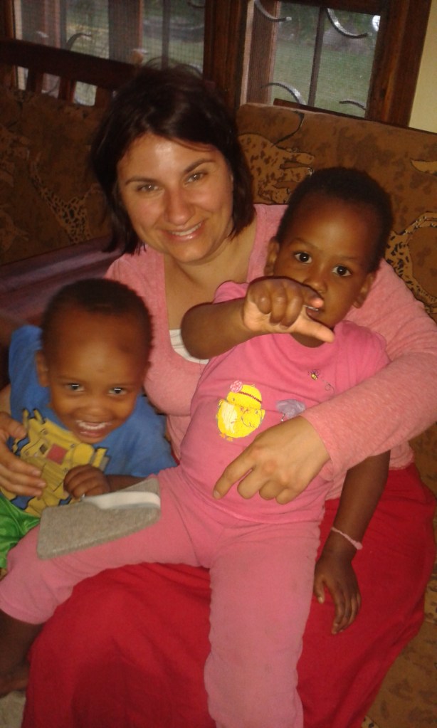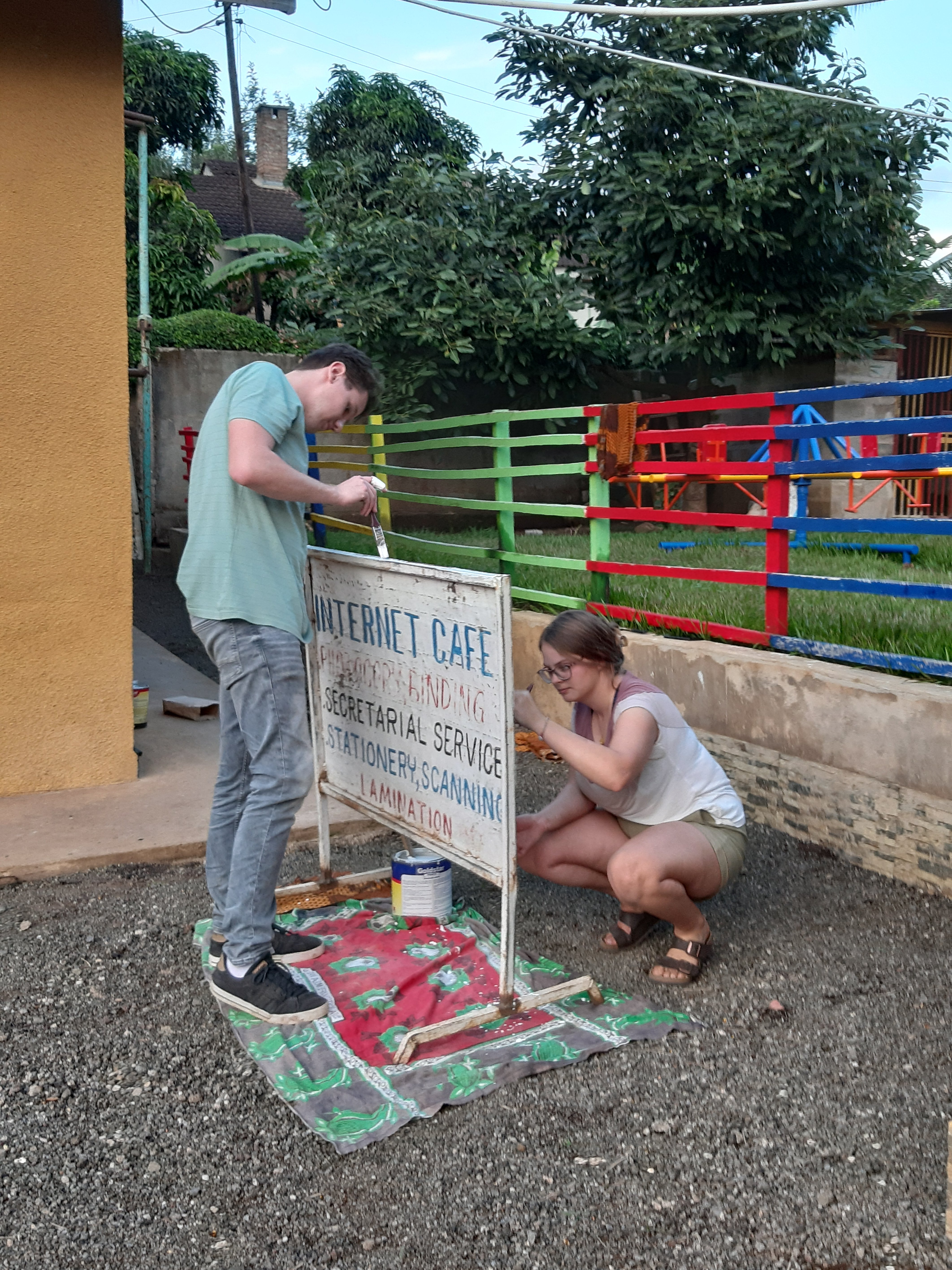 Hier die beiden in Jovitha´s frisch eröffnetem Montessori Kindergarden „A great Beginning“ am Schild basteln und mehr…